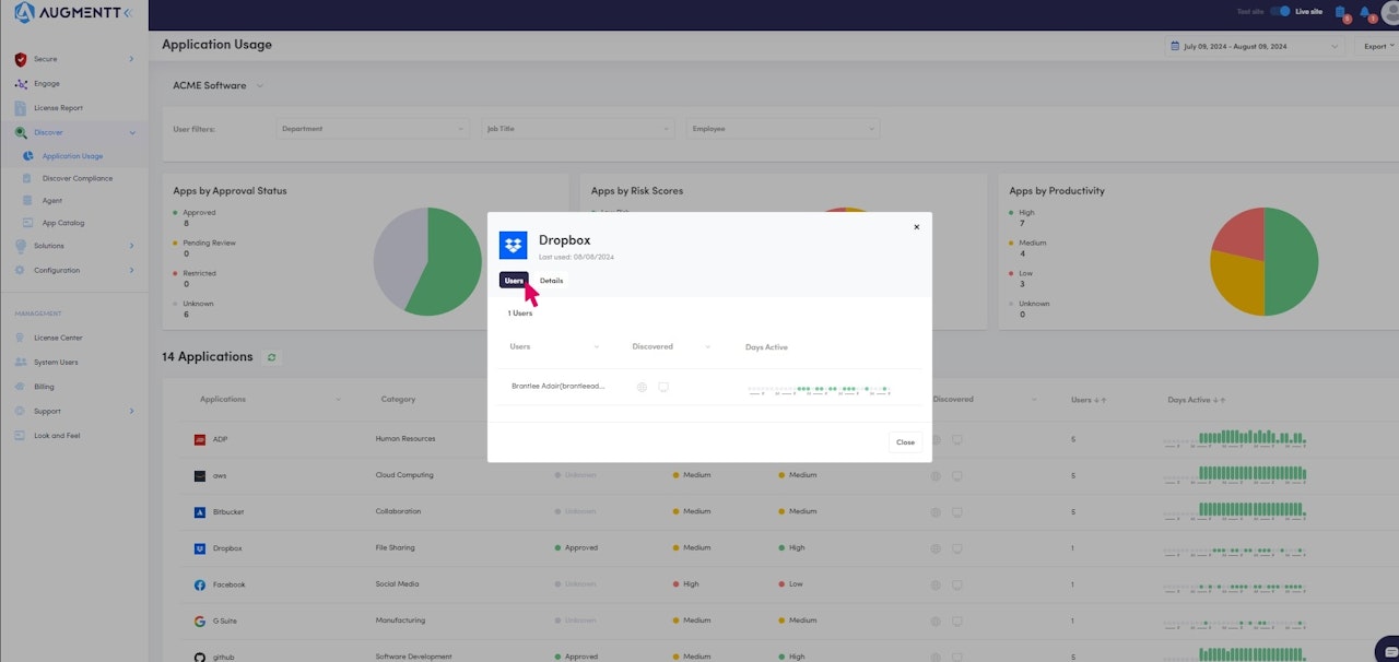Monitoring and analyzing how various applications are used within an organization is essential for Shadow IT. The Application Usage provides insights into how applications are being used within an organization. This feature enables MSPs to: