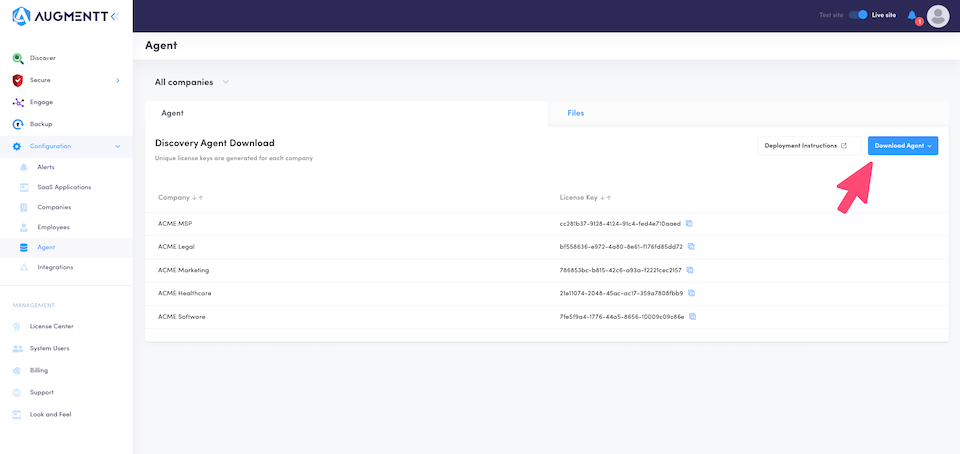 The Augmentt Agent installer requires the license key shown in the picture above at time of install and regardless of installation method the technician must provide this information