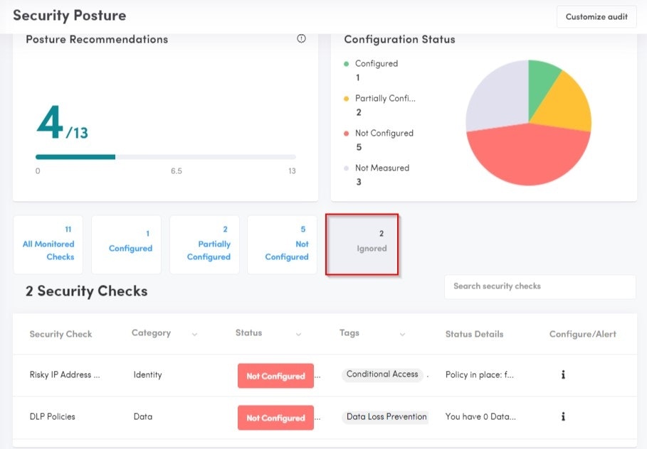 Unselected checks from your baseline will move to an ignored filter on your customer’s Posture audit page, while your scoring will reflect only the monitored checks. You can still quickly access the ignored checks and see their status details… a great way to remind your customers of additional service tiers!