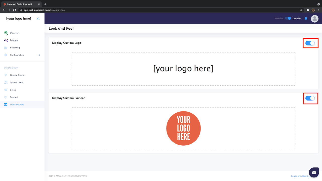 After uploading your company logo and favicon, you can use the toggle switches to enable or disable your custom branding