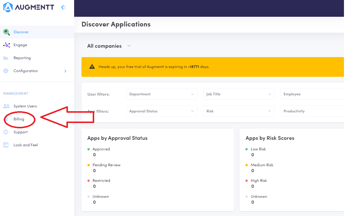 1. Log in to your Augmentt account and navigate to the Billing tab