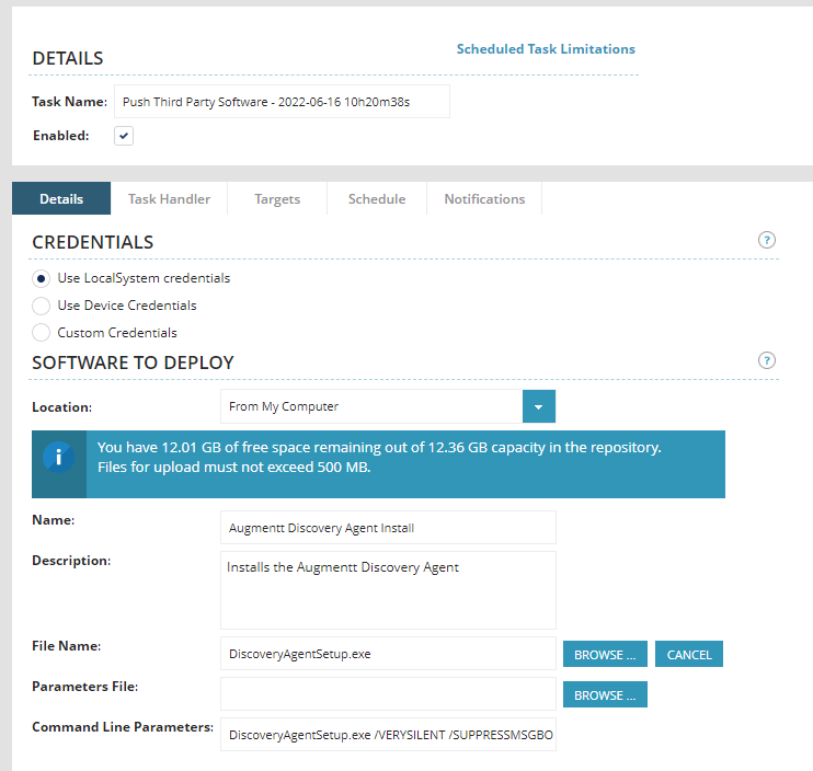You can begin by uploading a copy of the Augmentt Discovery Agent to your Software Repository under Configuration > Scheduled Tasks > Script/Software repository. Augmentt has a single agent for all customers, the license key ensures it calls in to the right MSP/Company. As such, you can store this at your SO level.