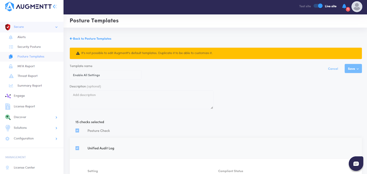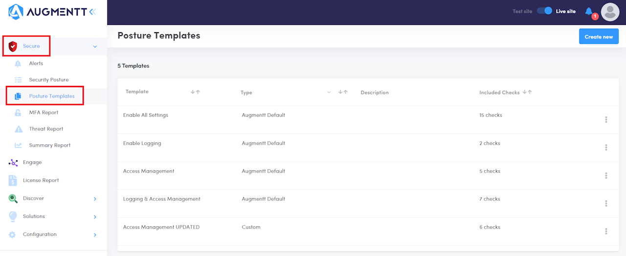 There you will find four Augmentt Default Templates you can use: Enable All Settings, Enable Logging, Access Management, and Logging and Access Management. You also can create your own template by clicking on the blue Create New button in the top right-hand corner of the screen.